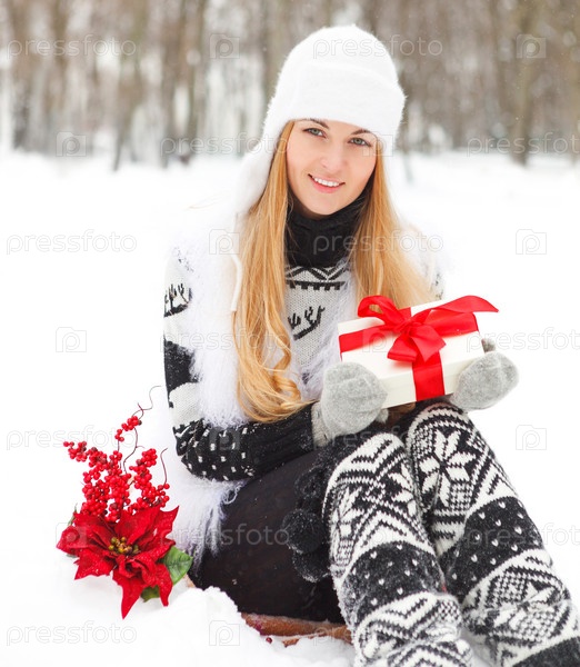 Молодаяя женщина, держащая подарок, оформленный красной лентой
