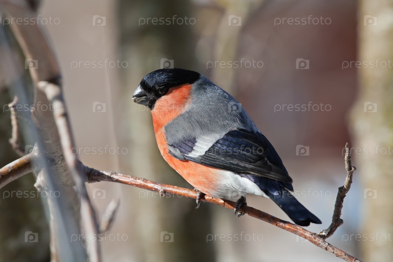 Самец снегиря сидит на ветке рябины