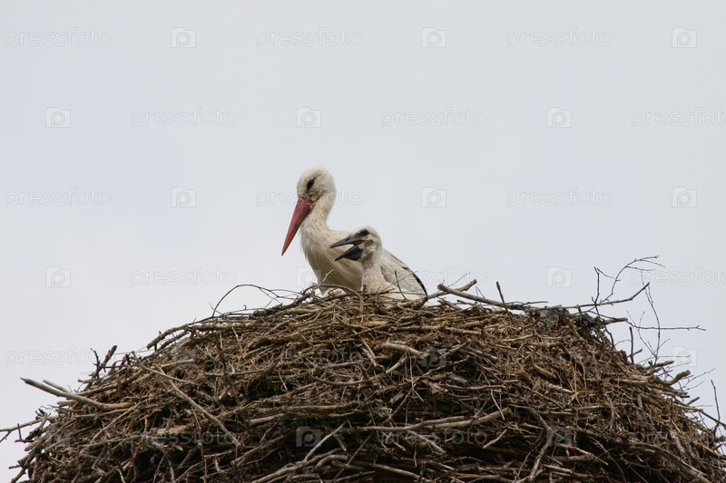 Белый аист с птенцами в гнезде
