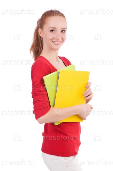 Студентка с книгами на белом фоне