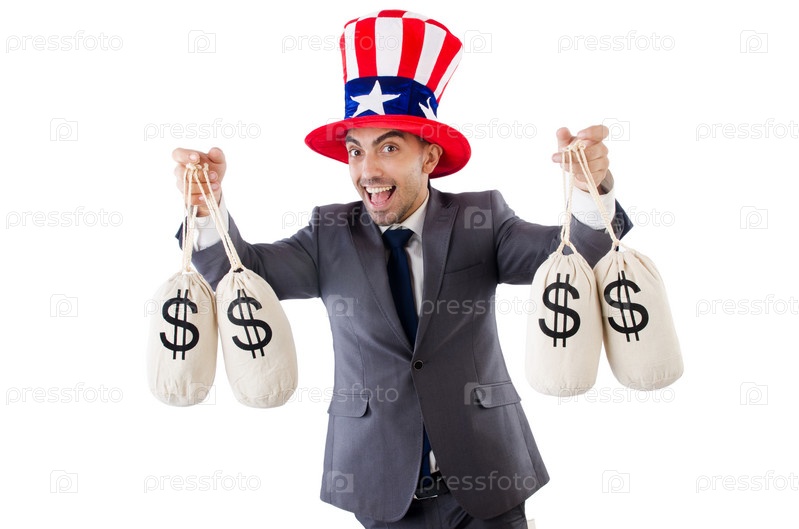 Человек с мешками долларов на белом фоне
