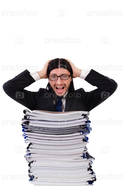 Забавный человек с большим количеством документов на белом фоне