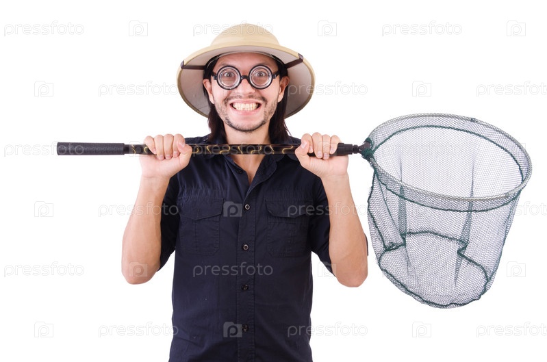Забавный парень с сачком на белом фоне