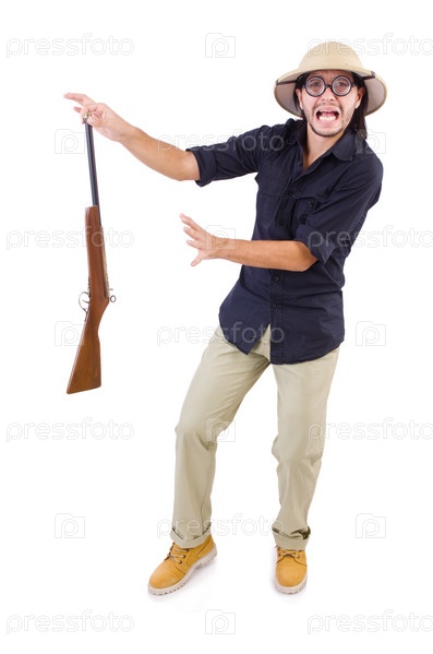 Смешной охотник в пробковом шлеме