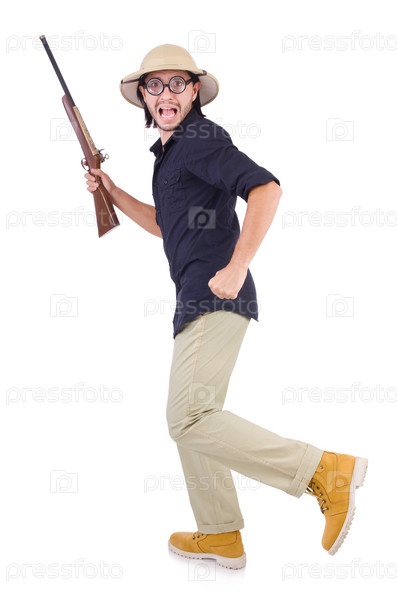 Смешной охотник в пробковом шлеме