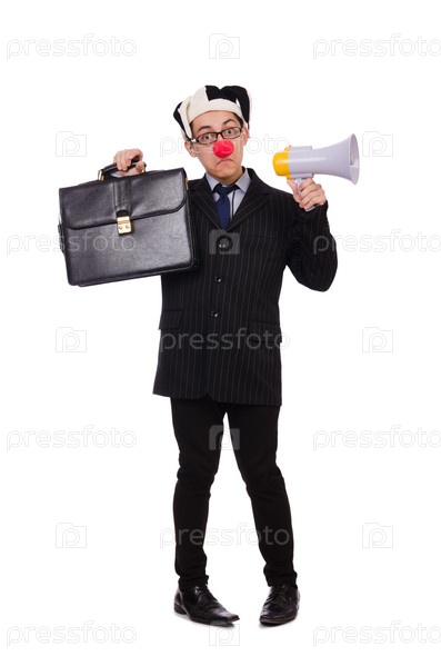 Бизнесмен-клоун с громкоговорителем на белом фоне