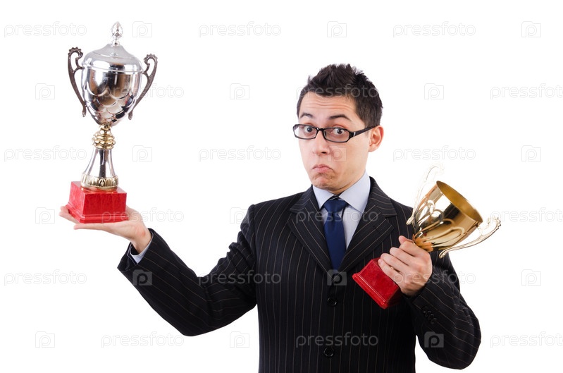 Забавный парень получает награду на белом фоне