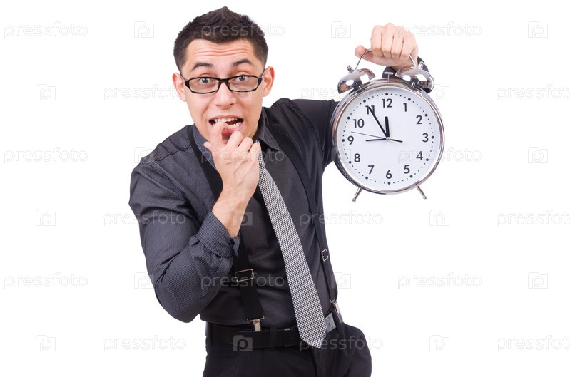 Смешной бизнесмен с часами, изолированный на белом фоне