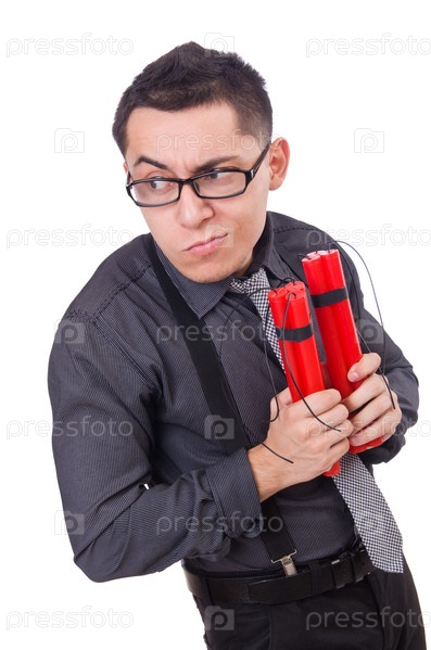 Бизнесмен с динамитом, изолированный на белом фоне