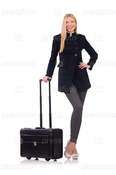 Деловая женщина с чемоданом на белом фоне