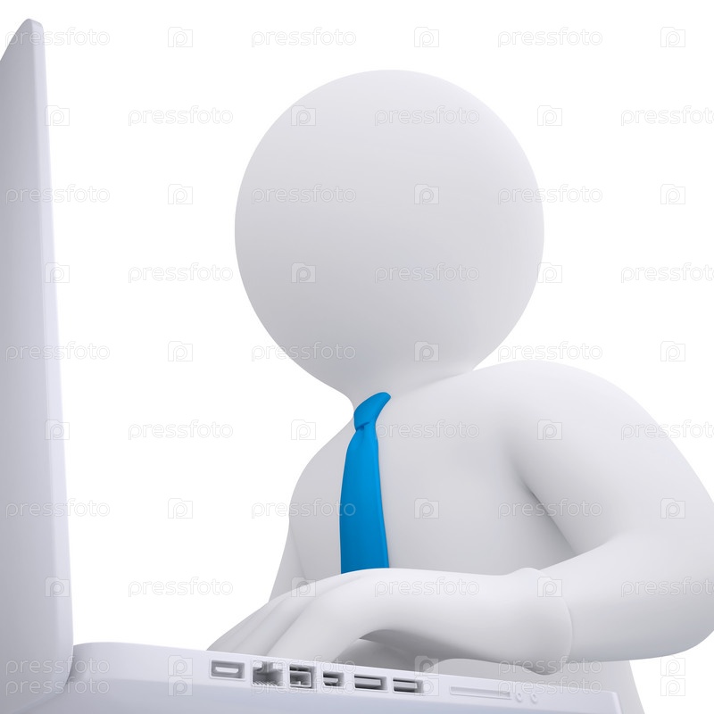 Белый 3D человек, работающий на ноутбуке