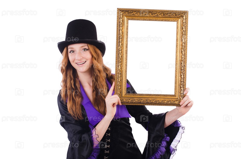 Женщина с фоторамкой на белом фоне