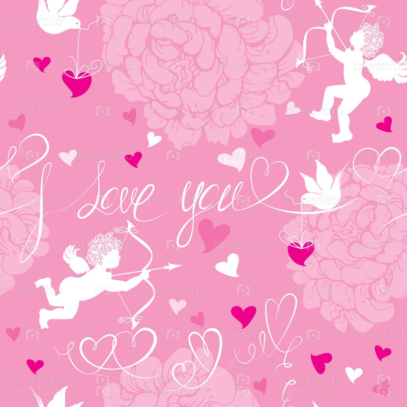 Розовый бесшовный фон с цветами, ангелами и голубями на День Святого Валентина