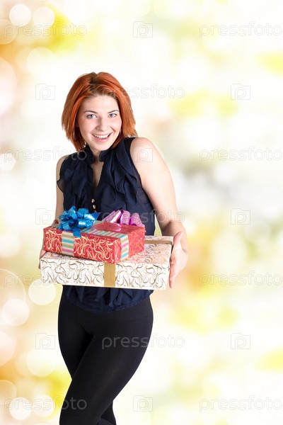 Счастливая улыбающаяся рыжая девушка с праздничными подарками
