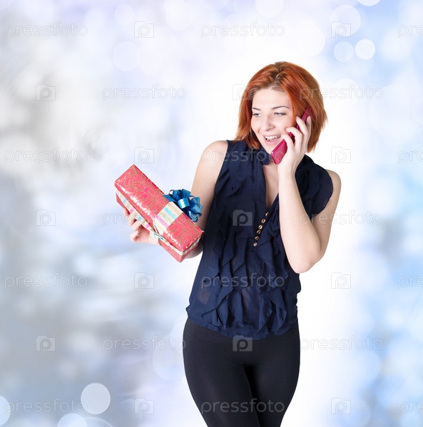Счастливая улыбающаяся рыжая девушка с праздничными подарками разговаривает по телефону