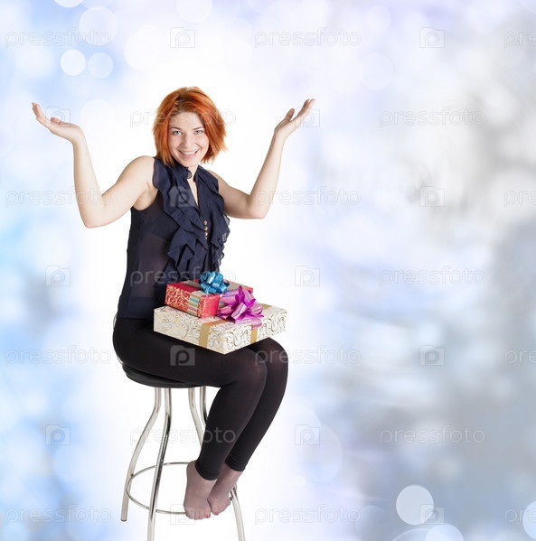 Счастливая улыбающаяся рыжая девушка с праздничными подарками сидит на стуле