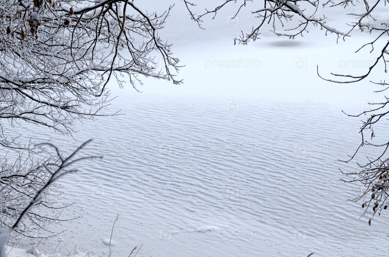 Рамка из заснеженных ветвей на замерзшем озере
