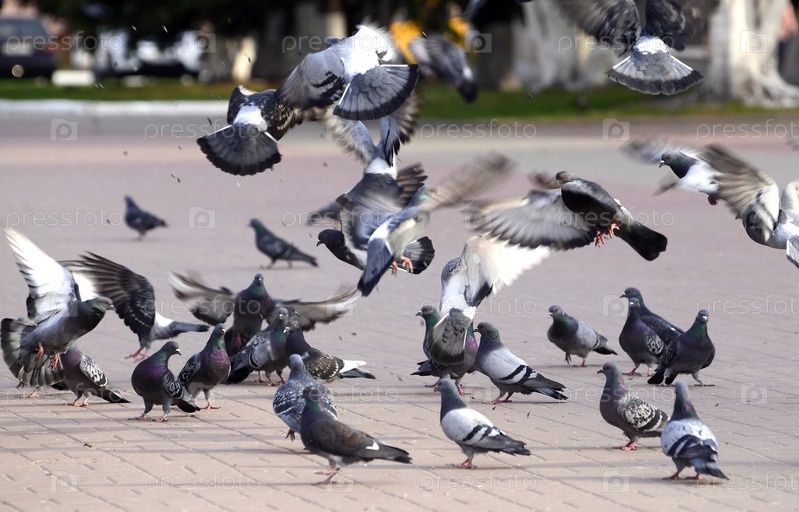 Стая голубей ловит корм в парке