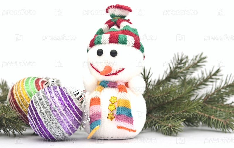 Рождественская композиция - снеговик с ветвями елки и елочные шары