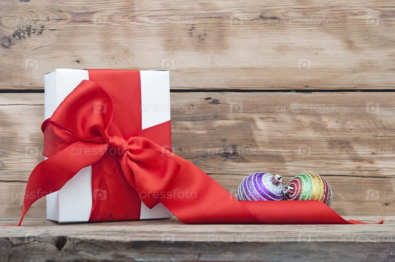 Подарок и елочные шары на деревянном фоне