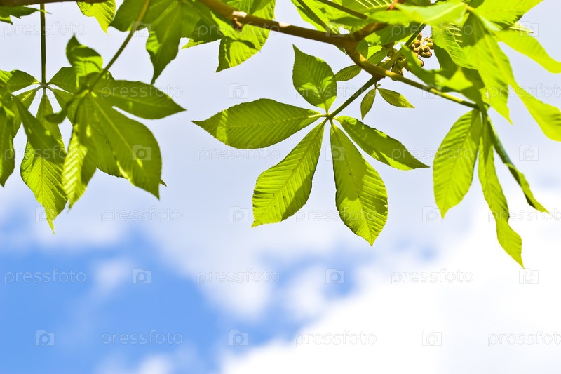 Зеленые листья на фоне синего неба