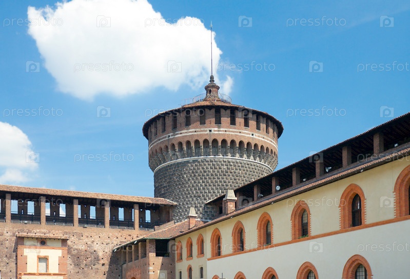 Вид на Угловую башню со двора замка Сфорца (XV в.), Милан, Италия