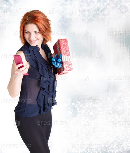 Счастливая улыбающаяся рыжая девушка с праздничными подарками разговаривает по телефону