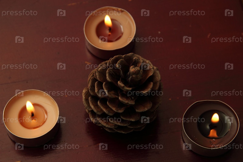 Три свечи и шишка в коричневых тонах