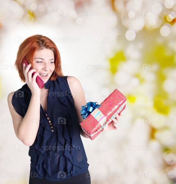 Счастливая улыбающаяся рыжая девушка с праздничными подарками разговаривает по телефону.Праздничные тарифы сотовой связи
