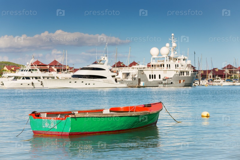 Рыбацкая лодка на фоне роскошных яхт, райский остров, Маэ, Сейшельские острова
