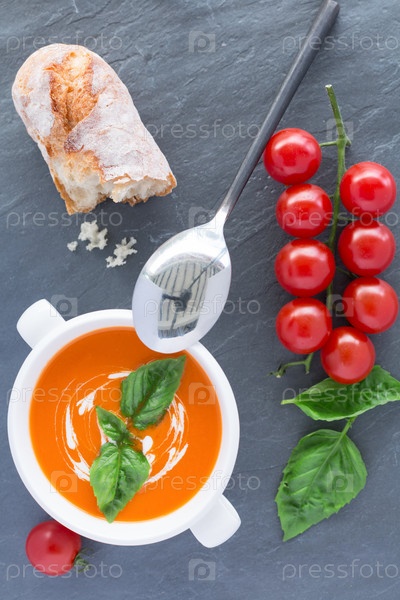 Томатный суп со сливками и листьями свежего зеленого базилика
