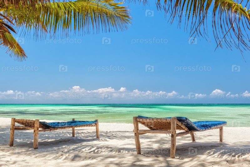 Пляжные шезлонги под пальмой на берегу Индийского океана