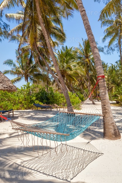 Гамак на пляже между двумя деревьями с тенью на белом песке
