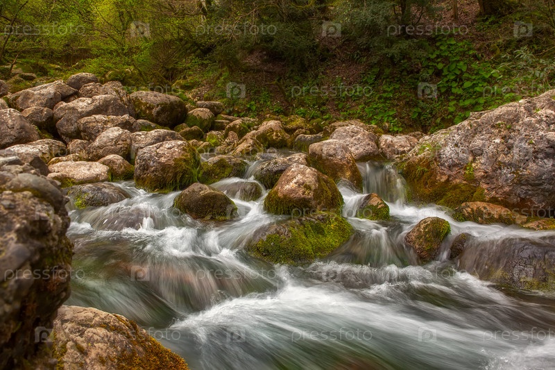 Горная река течет по камням в лесу