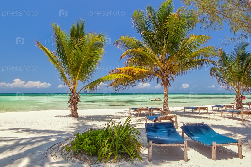 Пляжные шезлонги под пальмой на берегу Индийского океана