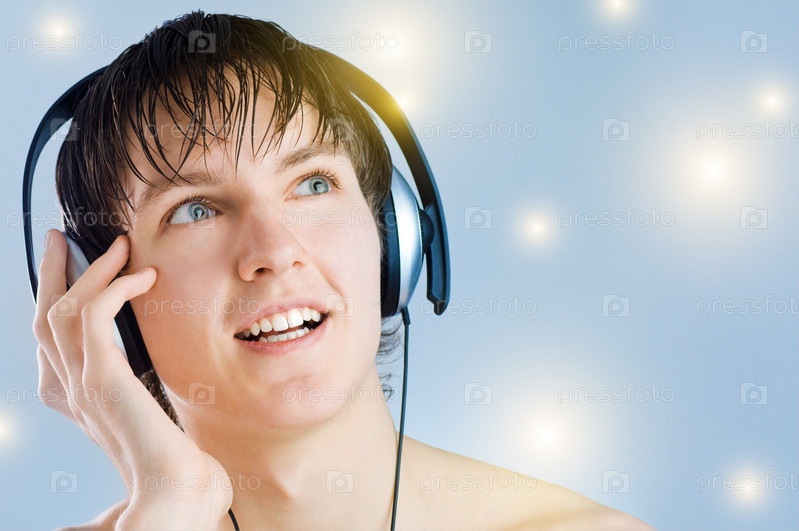 Человек в наушниках на синем фоне