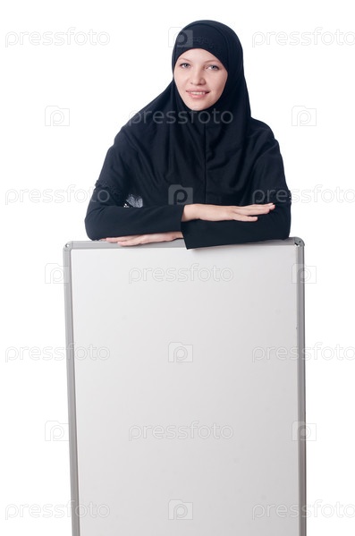 Мусульманская женщина с пустым баннером на белом