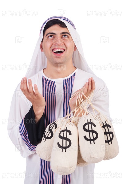 Араб с мешками денег, изолированный на белом