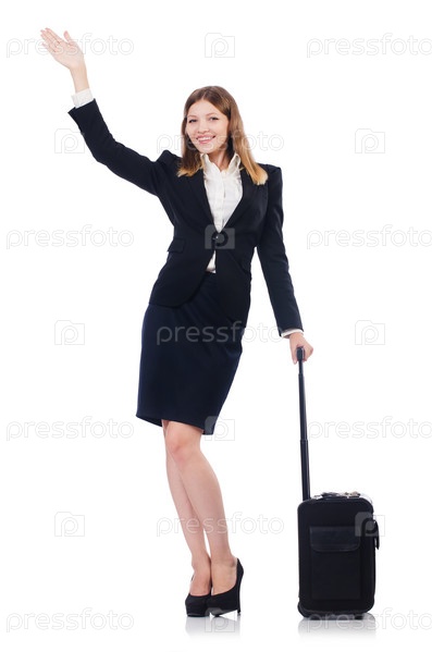 Женщина с чемоданом на белом фоне