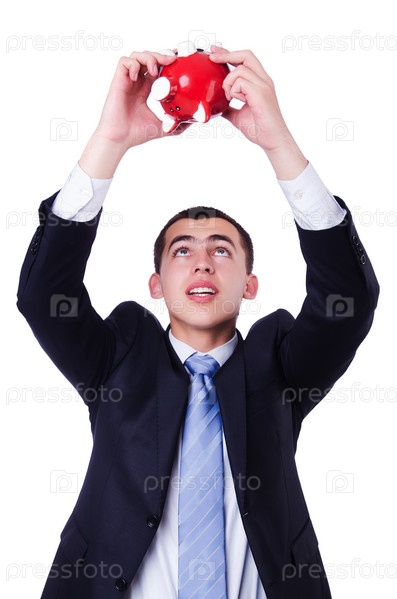 Человек с копилкой, изолированный на белом