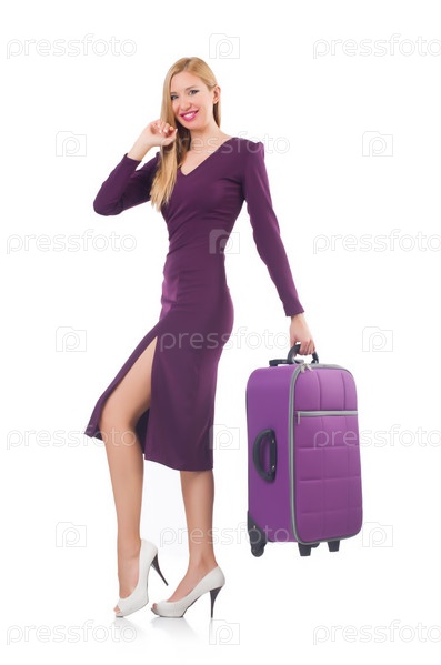 Женщина с багажом, изолированная на белом
