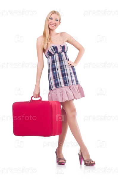 Женщина с багажом, изолированная на белом