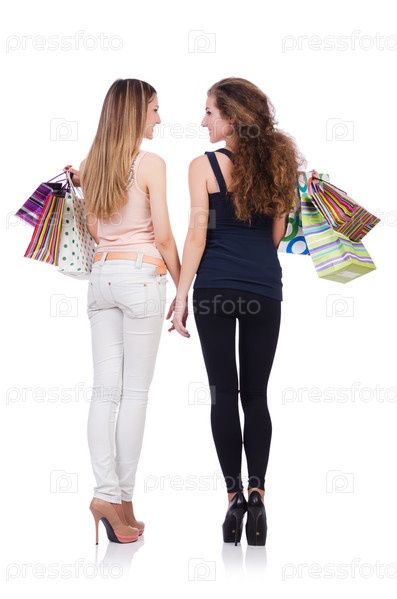 Лучшие подруги с покупками на белом фоне