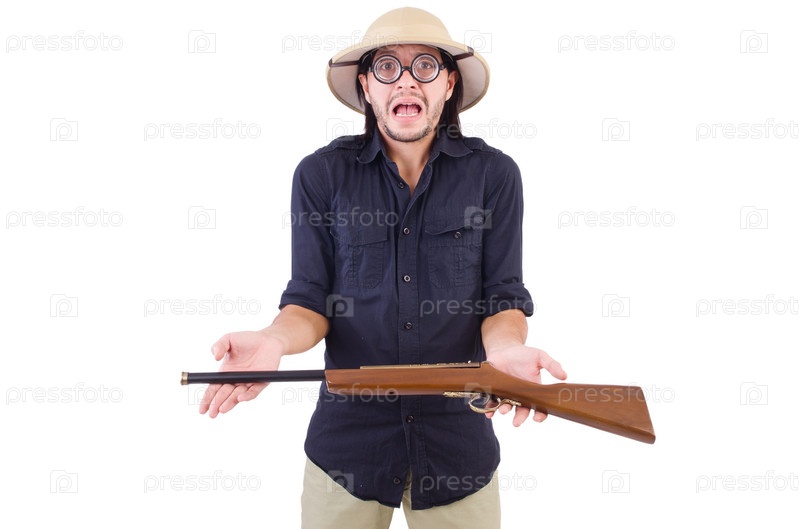Смешной охотник в пробковом шлеме