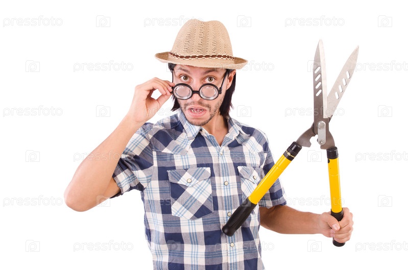 Забавный парень с садовыми ножницами на белом фоне