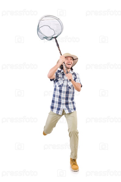 Забавный парень с сачком на белом фоне