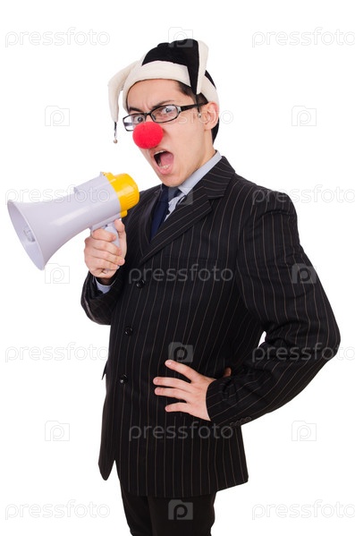 Клоун с громкоговорителем на белом фоне