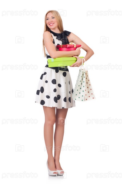 Девушка с покупками на белом фоне
