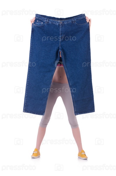 Женщина с большими джинсами в концепции диеты