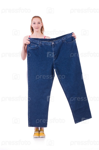 Женщина с большими джинсами в концепции диеты